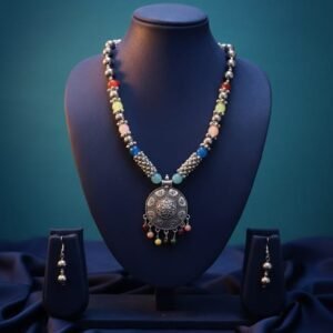 Oxidized Silver-Tone Beaded Necklace and Earring Set with Multi-Color Stone Drops