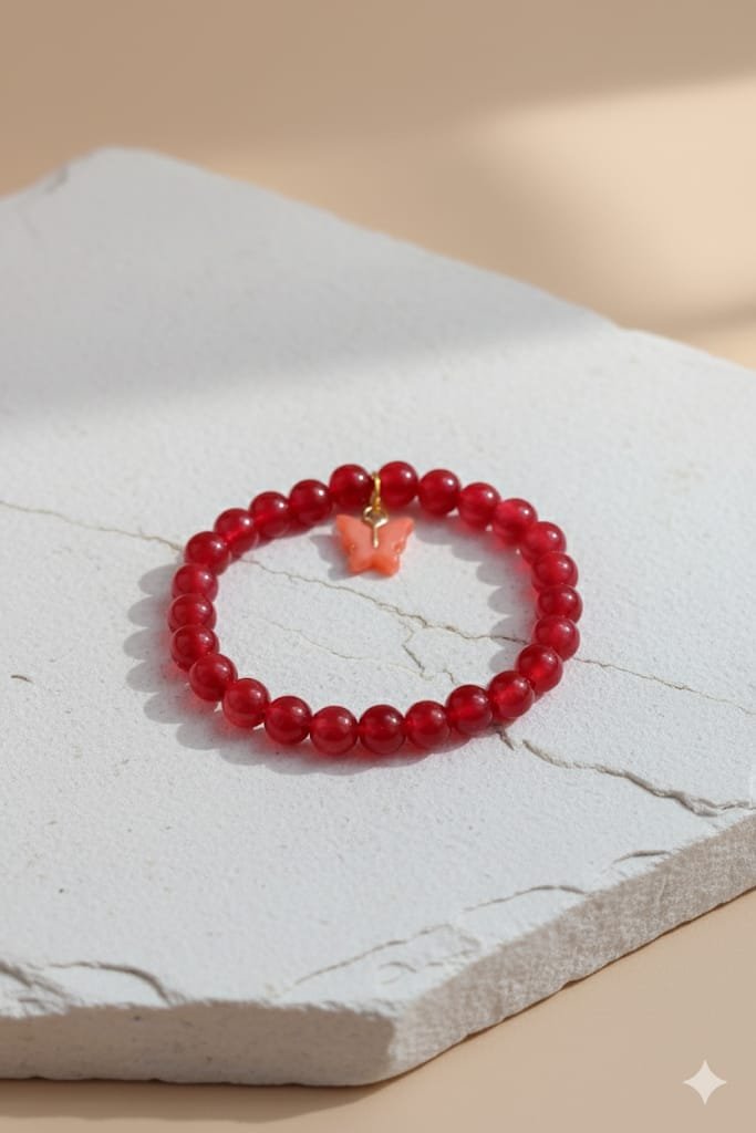 ​The bracelet is adorned with a single small charm positioned at the center. The charm is shaped like a butterfly and has a soft, translucent coral or peach color. It appears to be made of resin or acrylic and is attached to the beaded strand with a tiny gold-toned jump ring.