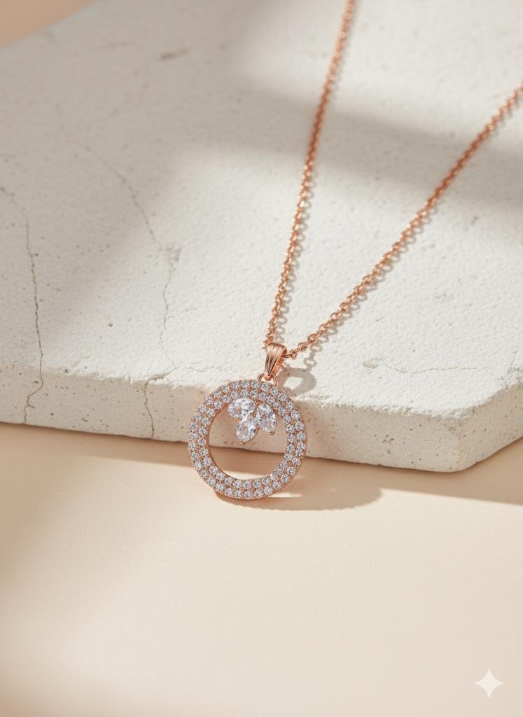Pendant Necklace: The necklace has a round Evil Eye pendant as its centerpiece. The pendant features the traditional concentric circles in shades of dark blue, light blue, and white, with a black center. This colorful enamel eye is framed by a dazzling circle of small, clear cubic zirconia or rhinestones. The pendant hangs from a delicate rose gold-tone chain.